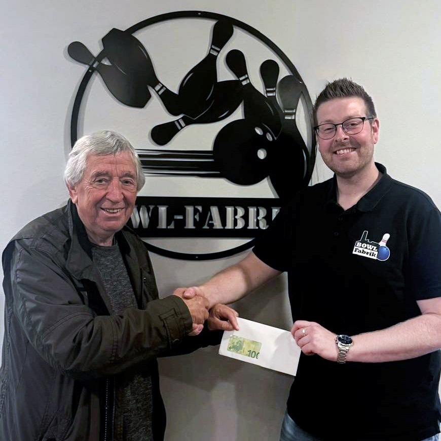 Eine Spende von 206 Euro konnte Hilfsgruppen-Vorsitzender Willi Greul in der Firmenich Bowl-Fabrik entgegennehmen. Christian Mahlberg von der dortigen Geschäftsführung übergab das Geld, das bei einem Schocker-Turnier zusammengekommen war. Für jeden Schock-Aus-Volltreffer spendete die Bowl-Fabrik einen Euro an die Hilfsgruppe. (Reiner Züll)