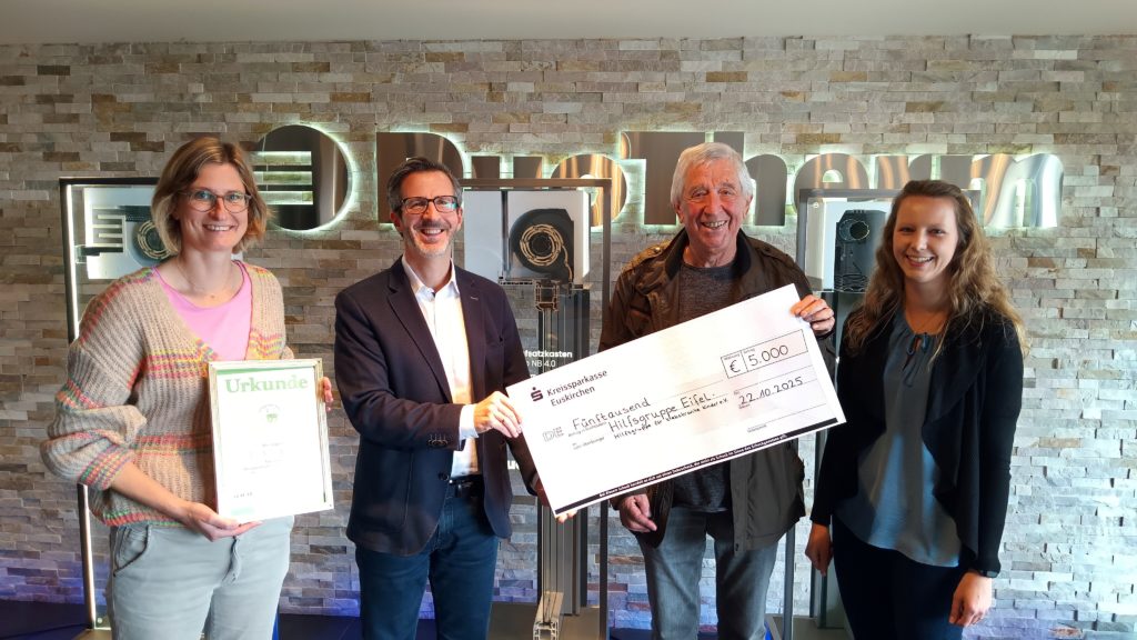 Kall/Zingsheim/Mechernich – „Uns war es wichtig, vor Weihnachten im Bereich der Kinderkrebshilfe etwas Gutes zu tun“, berichtete David Faust, Geschäftsführer der „DuoTherm Rolladen GmbH“, bei einer Spendenübergabe in der Zingsheimer Hauptniederlassung an die Hilfsgruppe Eifel. Einen Scheck über 5000 Euro überreichte Faust im Beisein seiner Mitarbeiterinnen Andrea Rau und Nina de Hoogd von der Marketingabteilung, an den Vorsitzenden der Kaller Kinderkrebshilfe, Willi Greuel.